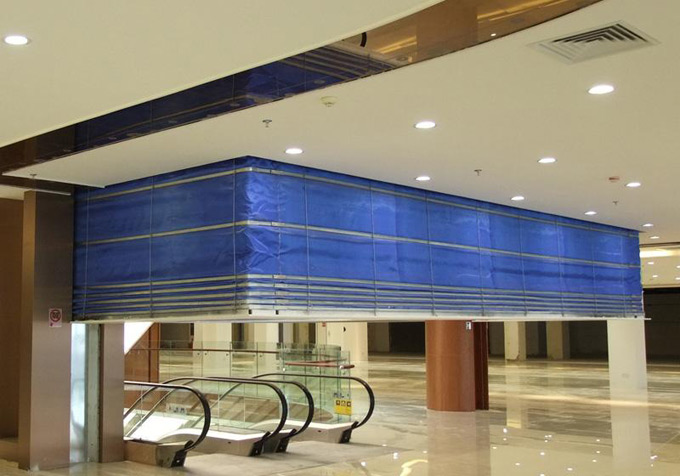 1、主要特點:將無機簾布折疊畫于底座箱,簾面下端與底座箱連接,上端固定于橫梁底部,并將鋼絲繩與卷軸及底座箱連接,利用兩邊巻軸巻動鋼絲繩,將底座箱平等提升,以達到卷簾的啟閉功能。